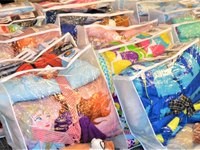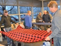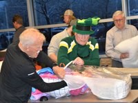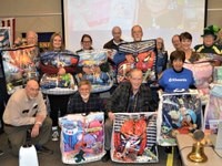On Thursday, April 6, 2023, Eyeopeners members pack about 35 “Sweet Dreams in a Bag” bedding sets, which will be given to children living in poverty. Wayne Fox, who along with his wife Susie, founded Sweet Dreams in a Bag, accepted a $2,500 donation from Eyeopeners to cover the cost of supplies.