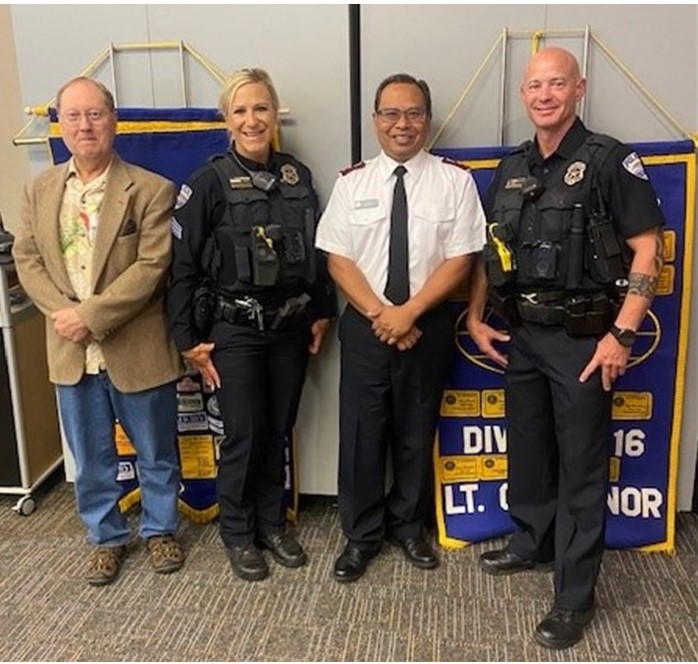 Sgt. Annie Hill and Officer William Kilcoyne from the Fort Collins Police Department spoke about the department’s Homeless Outreach and Proactive Engagement (HOPE) program at our July 6 meeting. The officers were guests of Eyeopeners member Gene Apuan and are joined by Eyeopeners President Elect Gary Klesner.