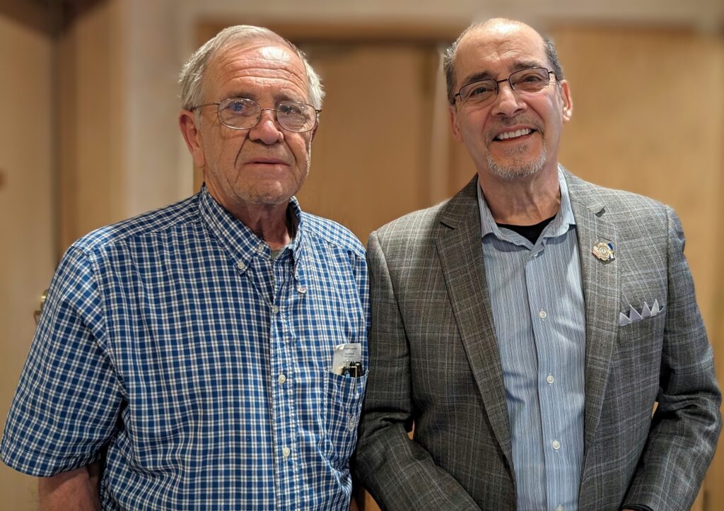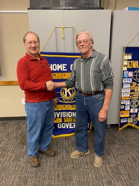 Gary Klesner congratulated Ray Kepler on receiving the Kiwanis Legion of Honor award for 25 years as a Kiwanis member.