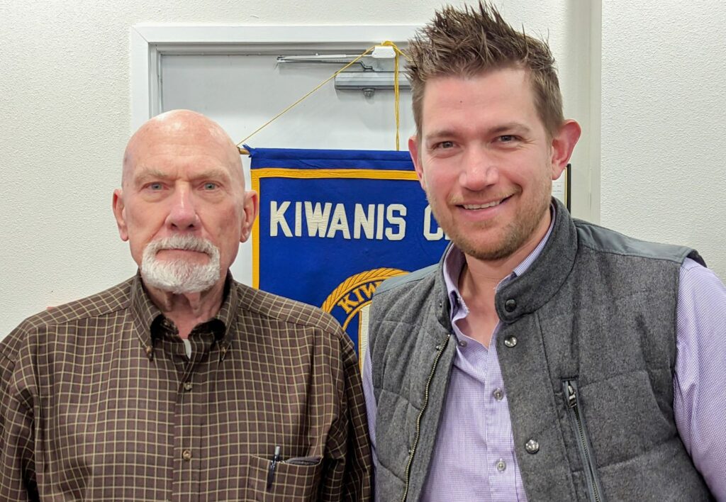 Ethan Dexter, right, Executive Director, Kids at Heart, presented on how the organization provides respite care for foster and adoptive families. Ethan was the guest of Eyeopeners member Dan Hemphill.
