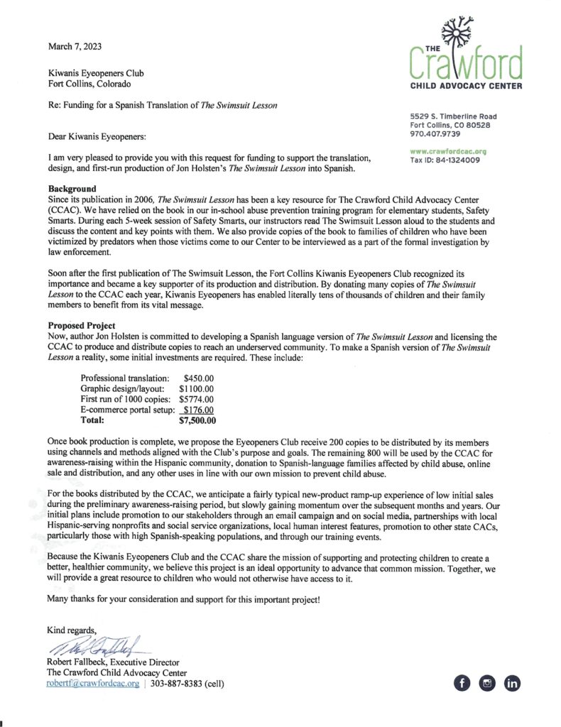 The Eyeopeners Kiwanis Club provided books to a number of different schools in Fort Collins in the past.  To augment availability to a more diverse population of kids,  in partnership with the Crawford Child Advocacy Center (CCAC) and author John Holsten,  the Eyeopener’s Foundation funded translation of the Swimsuit Lesson to a Spanish version.